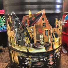 When I'm not drawing in my studio you can find me in a field somewhere. I've always enjoyed festivals and am very lucky to have painted and created at some amazing outdoor events over the years. Here are some of my paintings and installations, including a fair few bins created for Glastonbury Festival where I work for two months each year painting all sorts of weird things. Some of my special bins are used as flower planters in the backstage areas and dressing rooms. One of my bins was included in the Glastonbury Land and Legend exhibition at the V&A Museum!